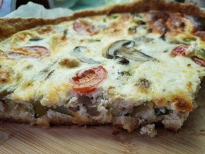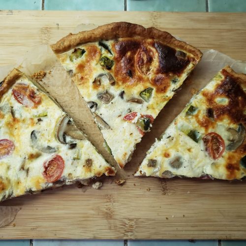 - posez la pâte dans le moule, garnissez le fond avec la moutarde, ajoutez la préparation de légumes refroidie, les tomates cerises coupées en deux et le fromage râpé.